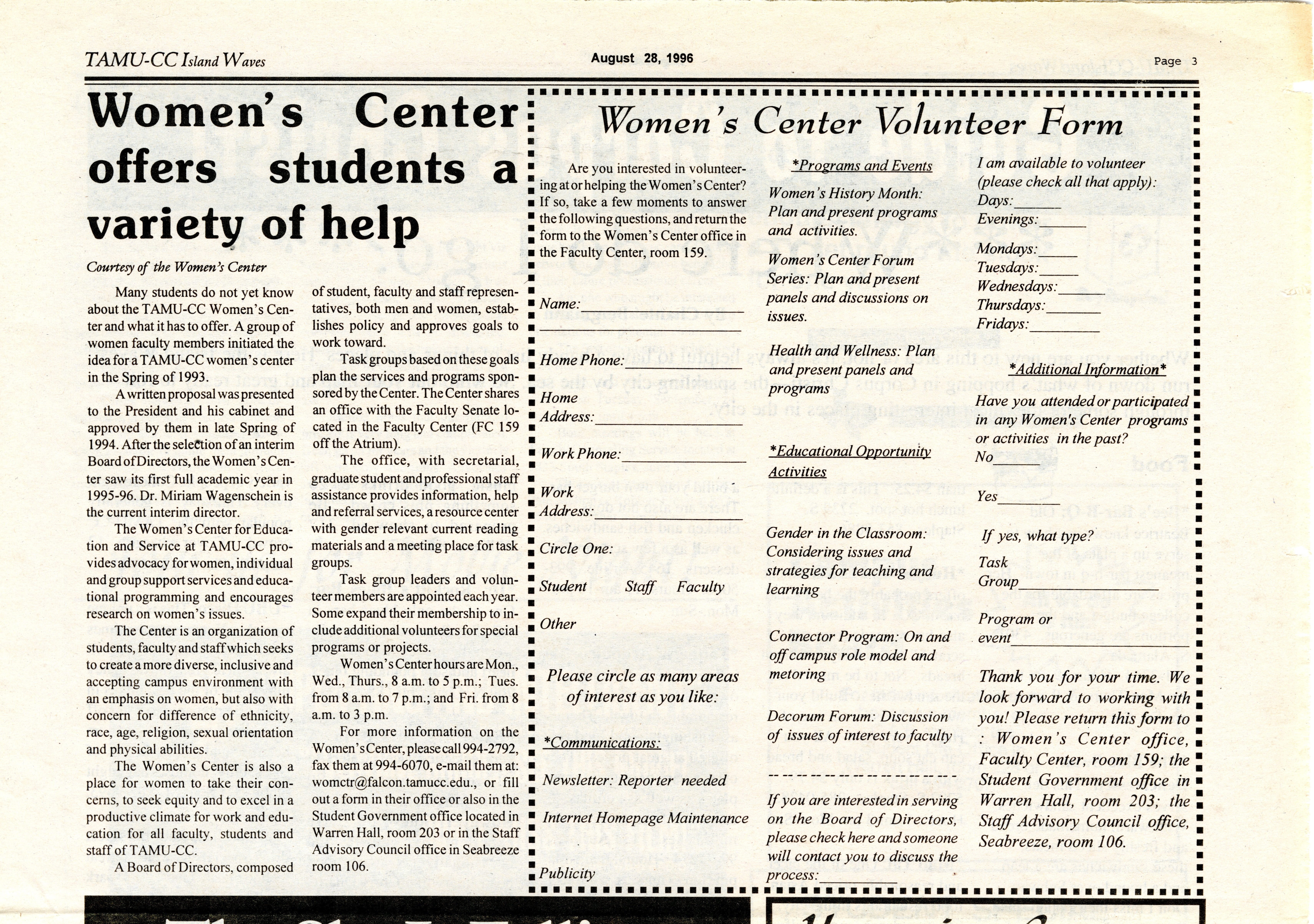Women’s Center offers students a variety of help. (1996, August 28). TAMU-CC Island Waves. 3.