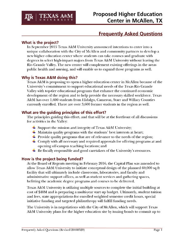 The Texas A&M University System released frequently asked questions about the proposed higher education center at McAllen.