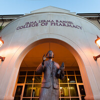 - A picture of the College of Pharmacy - Kingsville campus with the statue of Irma Lerma Rangel