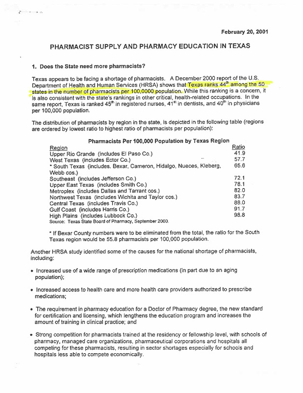 - A document from Irma Lerma Rangel with notes that address pharmacy supply and pharmacy education in Texas.
