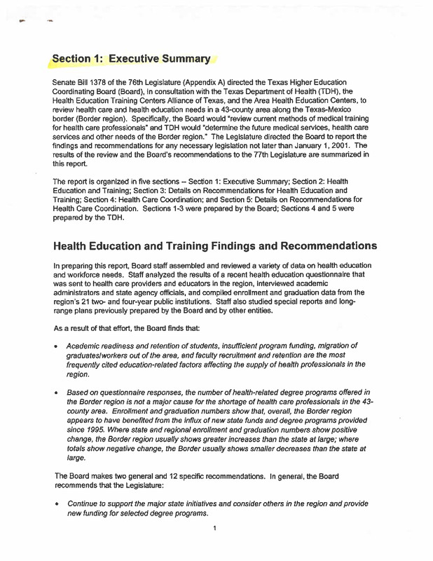 Summary of health care needs and education for health care professionals provided by the Texas Department of Health (TDH), the Health Education Training Centers Alliance of Texas, and the Area Health Education Centers
