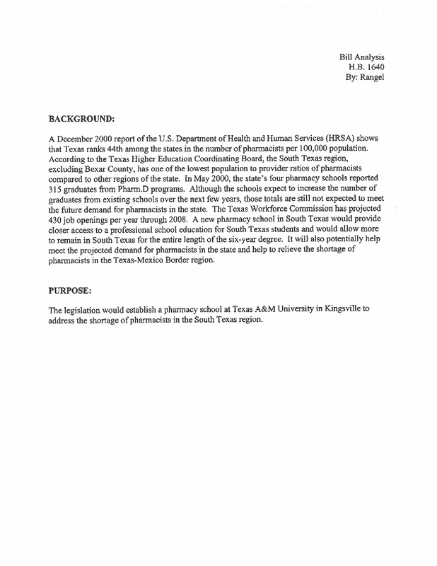 - Bill Analysis for House Bill 1640 written by Irma Lerma Rangel the provided the background and purpose for the bill.
