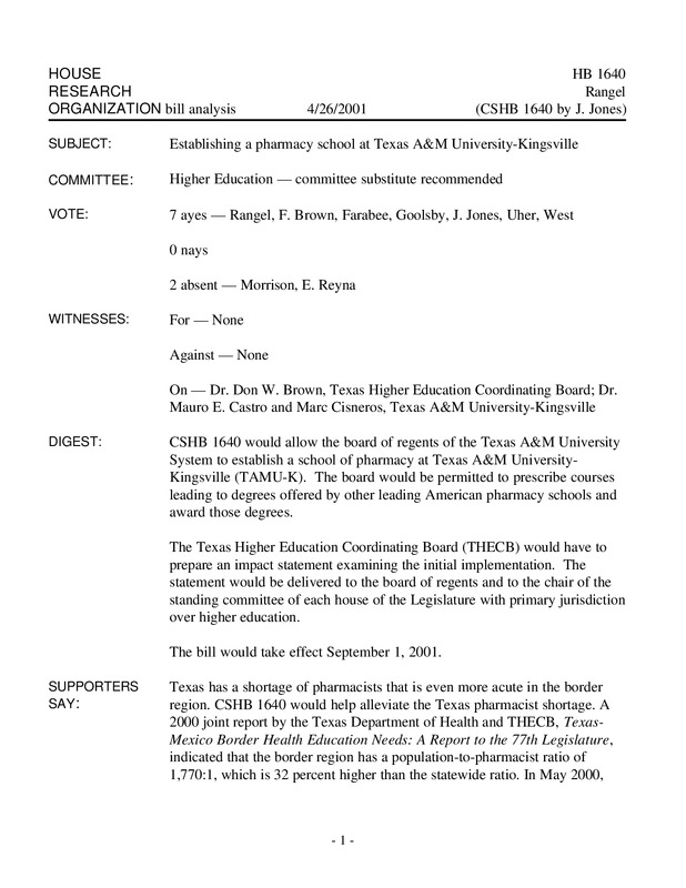 - House Research Organization. (2001). Bill analysis: HB 1640. Texas House of Representatives. Retrieved from https://hro.house.texas.gov/pdf/ba77R/HB1640.PDF