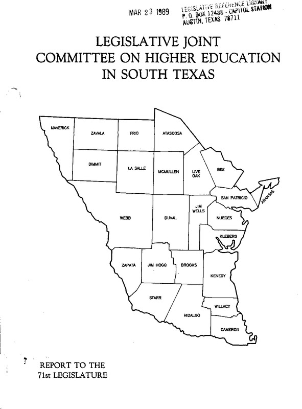 Truan, C., Cavazos, E., Barrientos, G., Caperton, K., Parker, C., Tejeda, F., Uribe, H., Zaffirini, J., Delco, W., Moreno, A., Patterson, P., Rangel, I., Smith, R., & Watkins, G. (1988). Legislative Joint Committee on Higher Education in South Texas. Texas Legislature. https://lrl.texas.gov/scanned/interim/70/ed84s.pdf