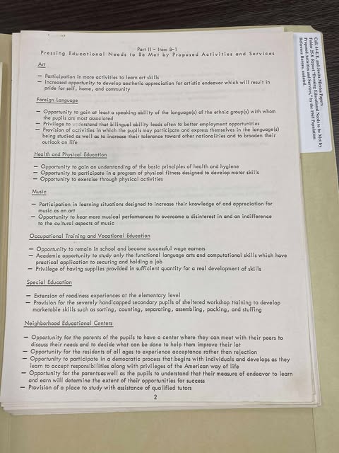 Document with pressing educational needs to be met by proposed activities and services including arts, foreign language, health and physical education, music, occupational training and vocational education, special education, and neighborhood educational centers.