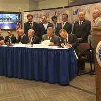 From Left to Right: Hidalgo County Judge Ramon Garcia, Texas A&M University President Michael K. Young, Texas A&M System Chancellor John Sharp and McAllen Mayor James "Jim" Darling. The officials gathered in McAllen, Texas, for a letter of intent ceremony where they announced the plan to open a new teaching facility on the city's north side.