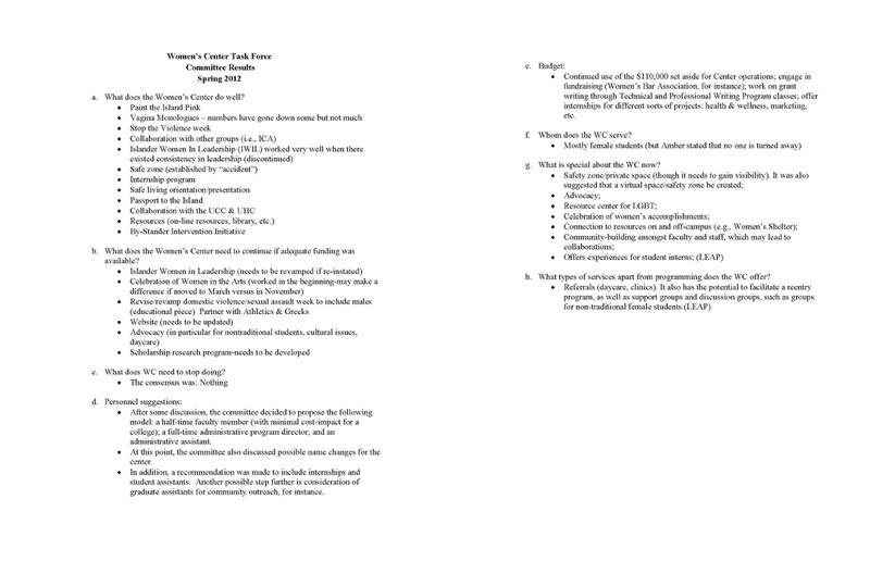 Women's Center for Education and Service Task Force. (2012). Committee Results. [Report]. Ann DeGaish Personal Files.