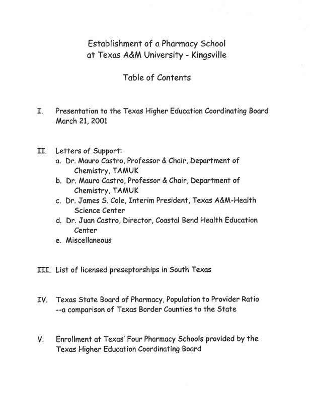 A document that provides support and need of establishment of a pharmacy school at Texas A&M University - Kingsville