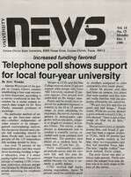 Telephone poll shows support for local four-year university (student news) This news article discusses a telephone survey conducted by a CCSU sociology class as a project that included local residents with telephones. The data they collected on public opinion concerning establishing a 4-year university in Corpus Christi is also mentioned. Topics of note discussed from the survey included setting up a 4-year university, funding for higher education, merging institutions, and attitude toward CCSU. It also mentions the limitations of the survery conducted.