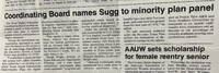 Coordinating board names Sugg to minority plan panel (student news) This news article discusses the panel assembled by the Texas Higher Education Coordinating Board with University President Sugg as chancellor. The article notes statistical data concerning minority enrollment numbers for their 5-year plan, and the successes that have been achieved in addressing minority enrollment disparities.