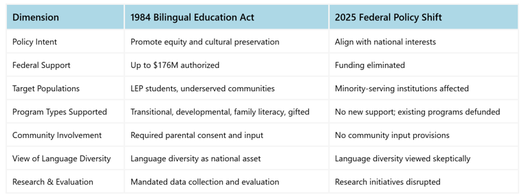 Comparing the 1984 Bilingual Education Act with the 2025 federal policy shift reveals a stark transformation in national priorities. In 1984, bilingual education was framed as a civil right and a national asset. The law recognized that language is central to identity, learning, and opportunity. It invested in programs that uplifted heritage speakers and empowered communities historically excluded from mainstream education. In contrast, the 2025 decision to defund critical language and area studies programs signals a retreat from those values.